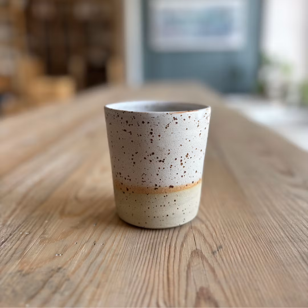 Handdrejad mugg i ljus lavalera med vit matt glasyr.