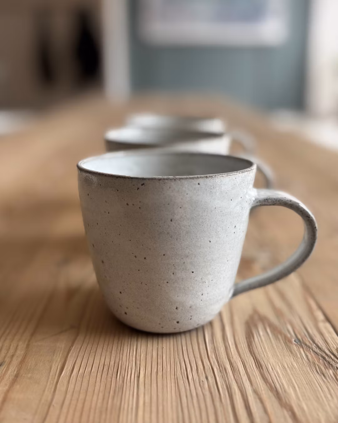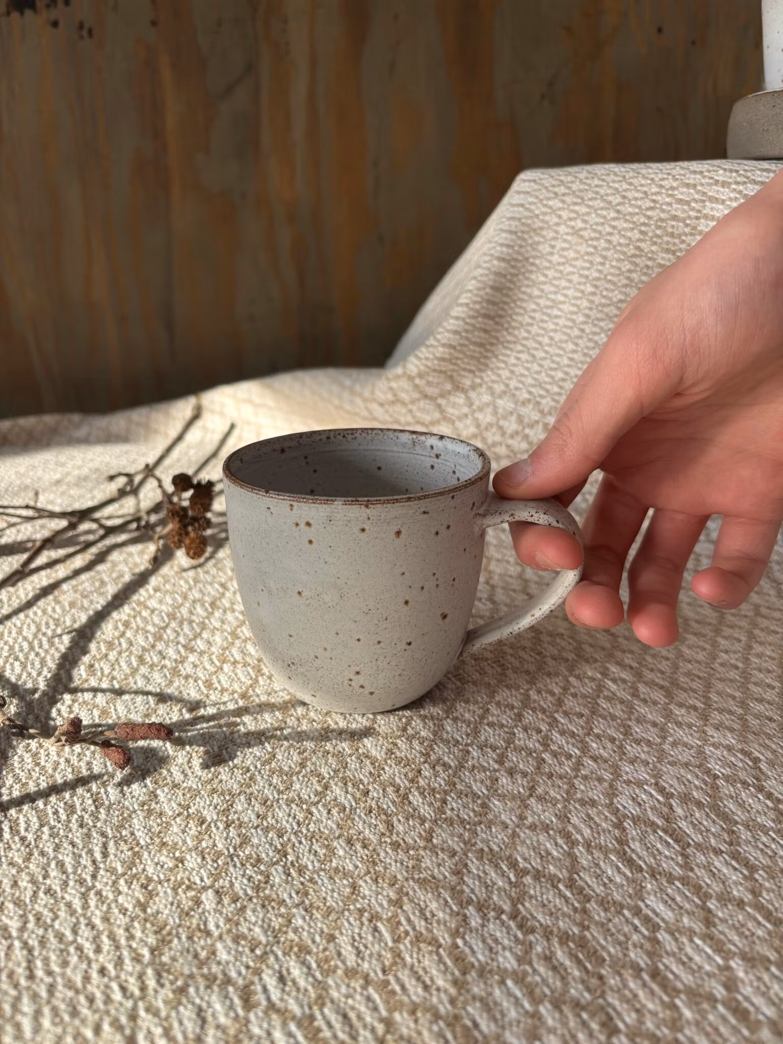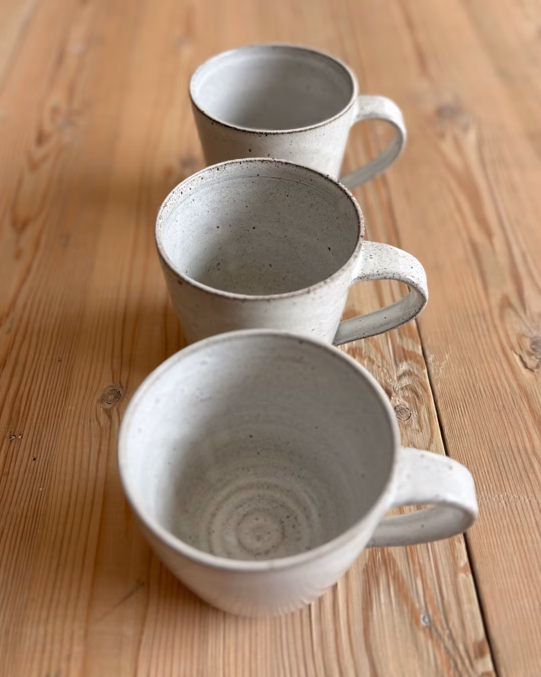 Handdrejad mugg i mörkstengodslera med lavaprickar och vit matt eller vit blank glasyr.