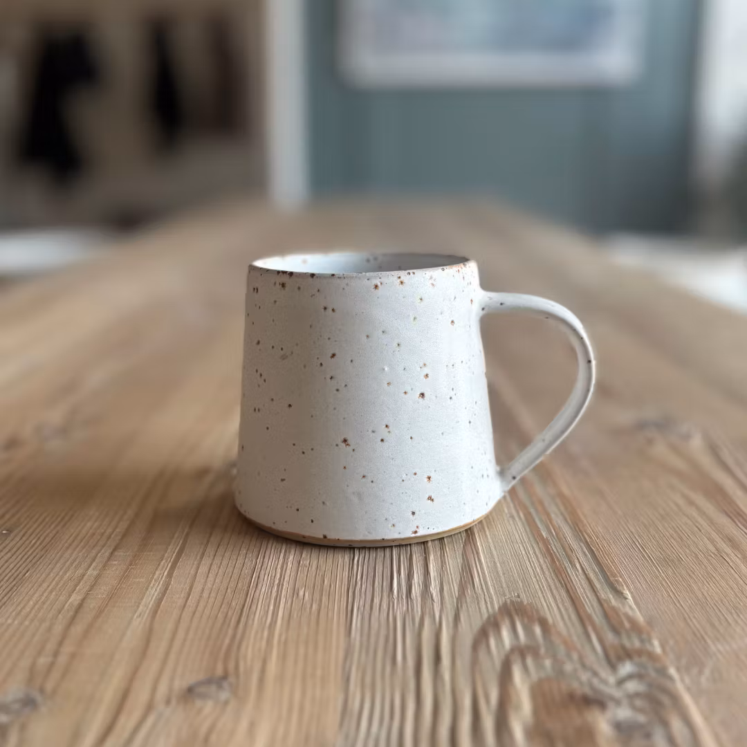 Handdrejad mugg i vit stengodslera med lava och vit matt glasyr.