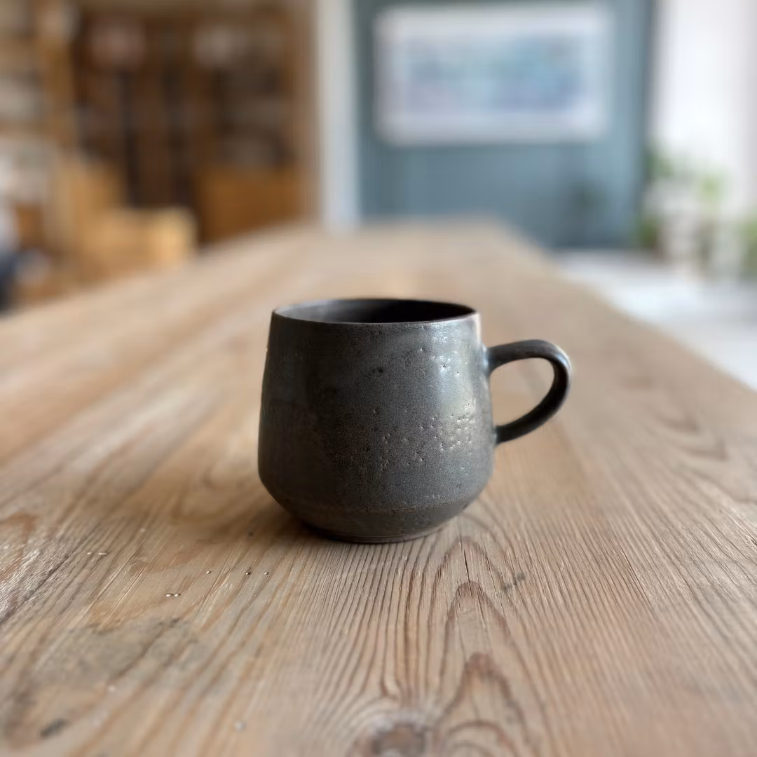 Handdrejad mugg i mörk stengodslera med mörkgrå sidenmatt glasyr.