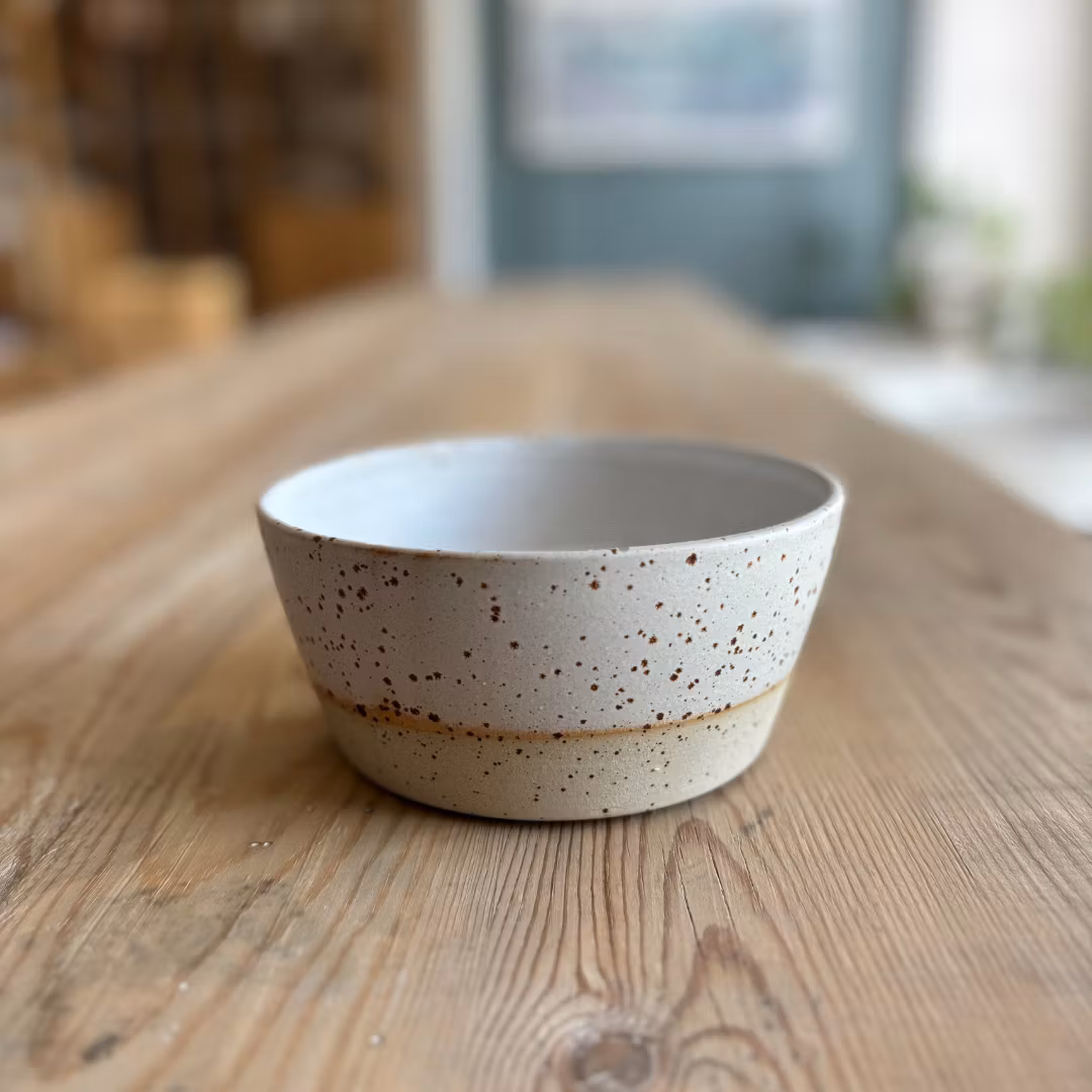 Handdrejad skål i ljus lavalera med vit matt glasyr.