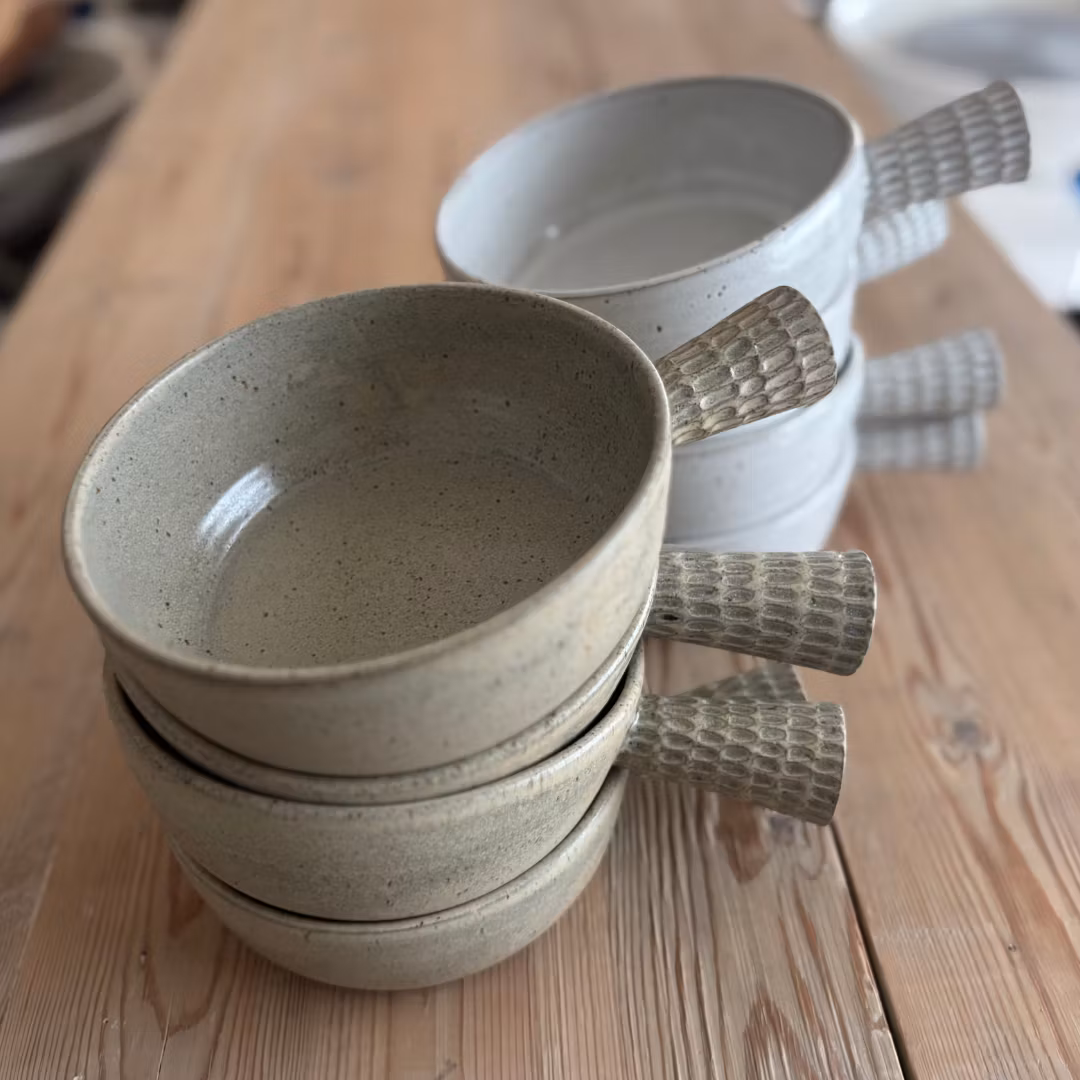 Handdrejad soppskål med handtag i ljusgrå stengodslera med gråbeige eller vit glasyr.