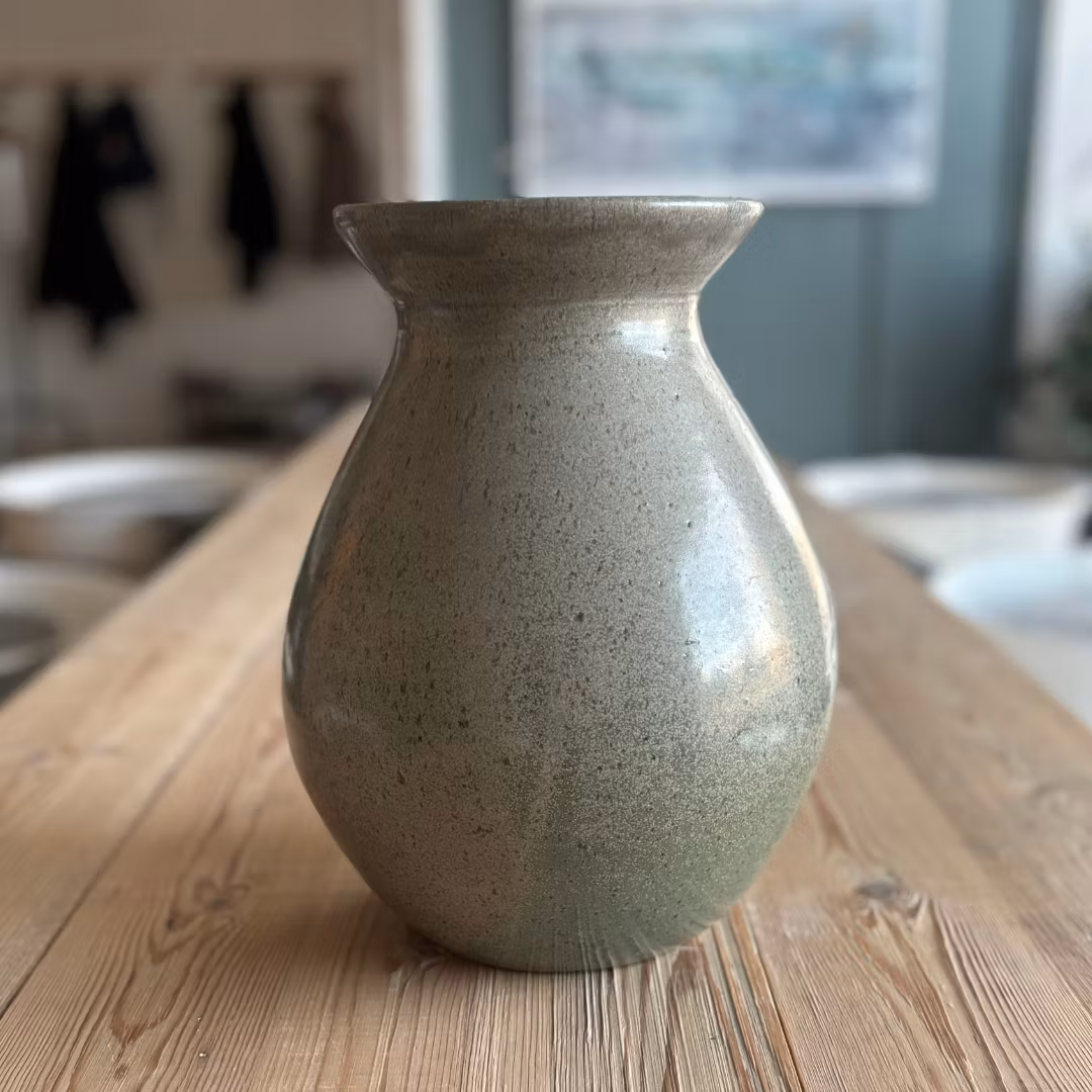 Magnifik vas i stengods med vackert melerad glasyr som skiftar i beige/ grå/ grön.