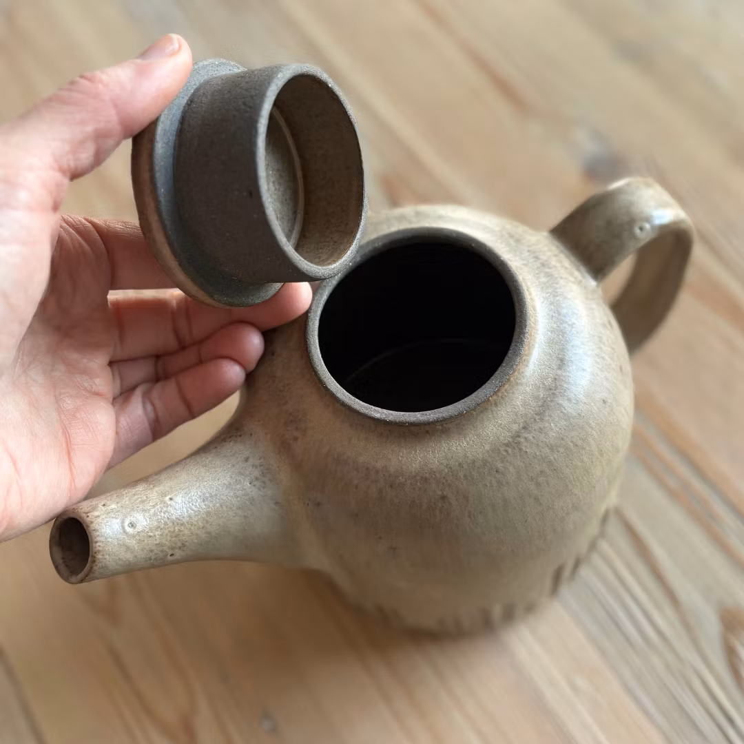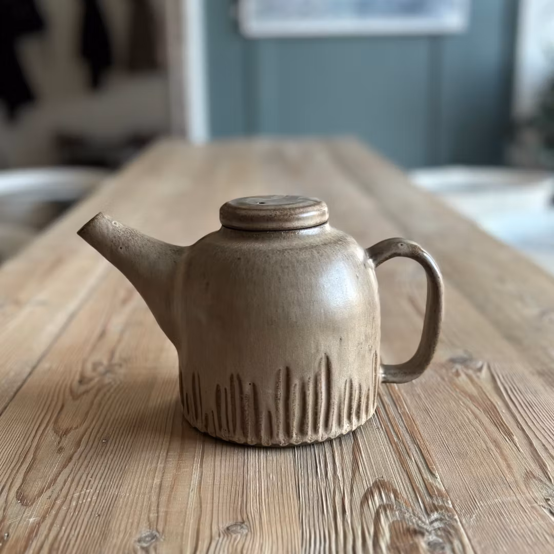 Handdrejad tekanna i grå stengodslera med cremefärgad sidenmatt glasyr.